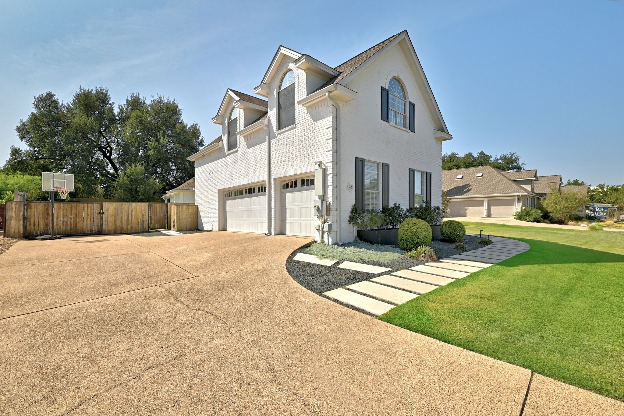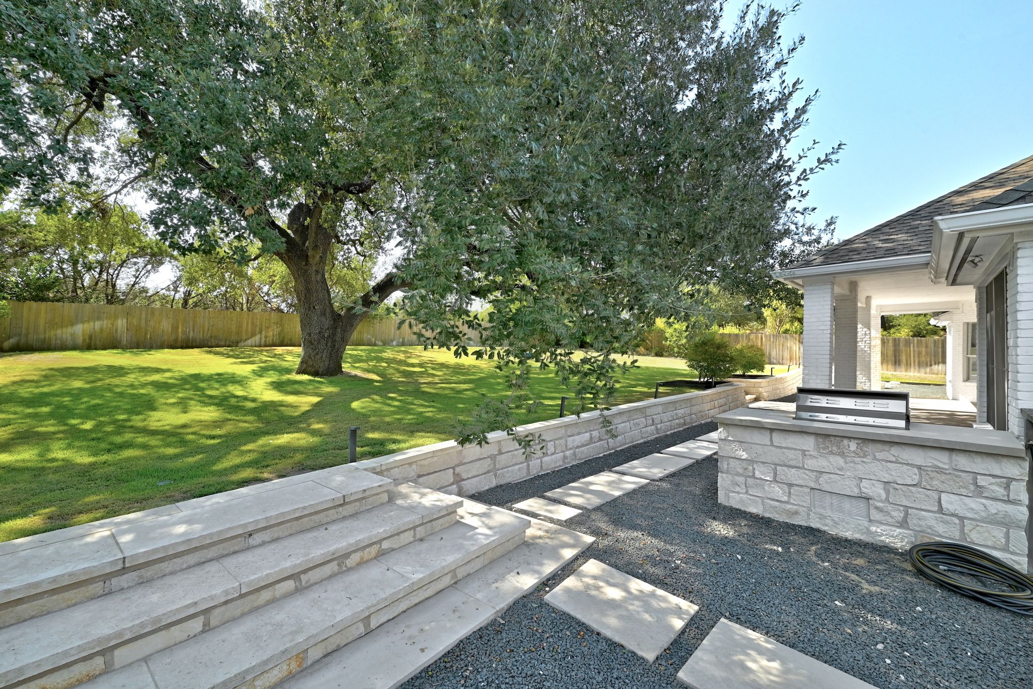 A built-in grill and generous patio space make entertaining a breeze, all shaded by a majestic century oak in the beautifully