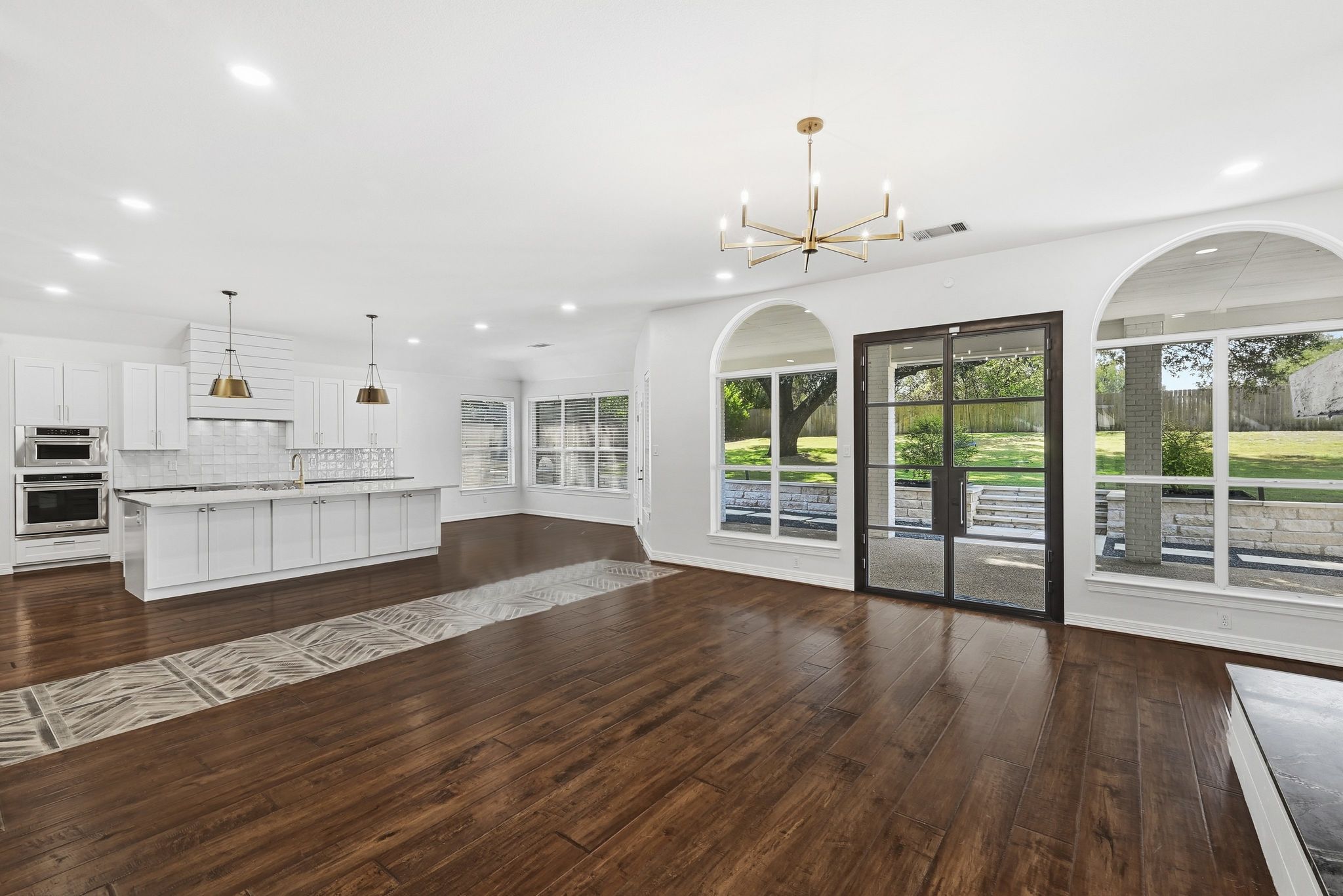 The house consists of an open floor plan with vaulted ceilings and natural light throughout. The newly updated kitchen features